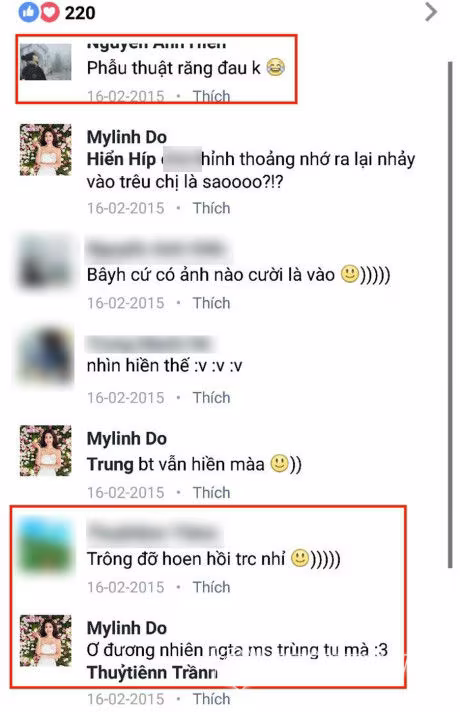 Cụ thể, một người bạn của Mỹ Linh hỏi cô rằng: “phẫu thuật răng có đau không?”, một người khác bạn để lại dòng bình luận: “trông đỡ hơn hồi trước nhỉ”. Đáp lại, Mỹ Linh để lại bình luận rằng: “Ơ đương nhiên, người ta mới trùng tu mà”.