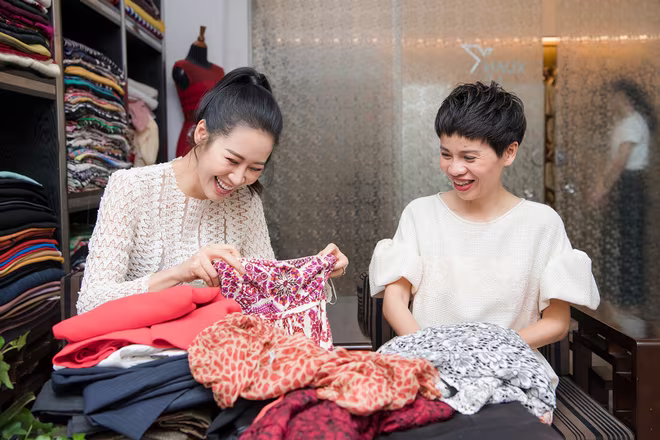 Hoa hậu Dương Thùy Linh (bên trái) mang đồ đến ủng hộ chiến dịch của nhà thiết kế Xuân Lê (bên phải)