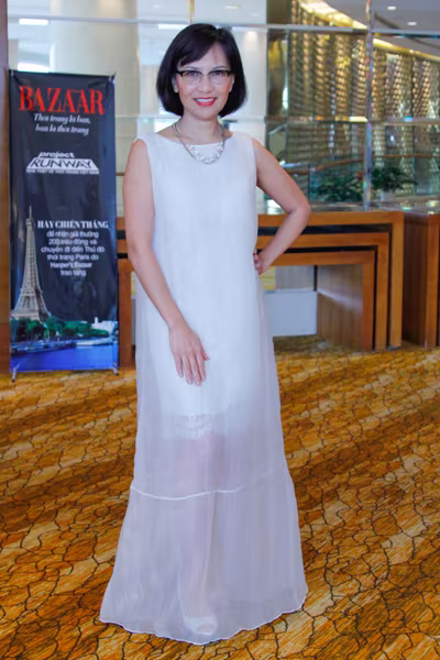 Bên cạnh Ngọc Ánh, đại diện tạp chí thời trang Harper’s Bazaar – nhà báo Trần Nguyễn Thiên Hương cũng không kém phần trẻ trung khi mặc lên mình một chiếc đầm maxi trắng vô cùng bắt mắt. Được biết đến là một giám khảo với những lời nhận xét sâu sắc và vốn kiến thức thời trang đáng nể, nhà báo Thiên Hương còn được biết đến là một nhà báo có phong cách, ấn tượng nhưng không kém phần sang trọng, quý phái.