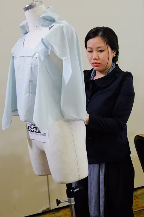 Cũng tại vòng thi tuyển khu vực phía Bắc vừa qua, nhiều thí sinh đã phải "toát mồ hôi" với thử thách làm mới chiếc áo sơ mi. Chỉ trong 60 phút phải thiết kế và hoàn thành sản phẩm, nhưng vẫn phải đảm bảo sự tỉ mỉ trong từng được kim mũi chỉ, chưa kể đến yếu tố sáng tạo luôn phải đặt lên hàng đầu là làm khó không ít thí sinh.