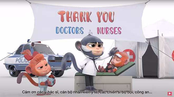 Có rất nhiều những lời tri ân sâu sắc nhất được các doanh nghiệp, các cá nhân gửi đến họ cả từ vật chất đến tinh thần trong suốt hơn 2 tháng qua. Để góp thêm lời cảm ơn tới những người anh hùng đó, hãng phim hoạt hình VinTaTa cũng kịp thời sản xuất và đăng tải video dài gần 2 phút với hình thức thể hiện sáng tạo qua hình ảnh những chú khỉ Monta 3D xinh xắn.