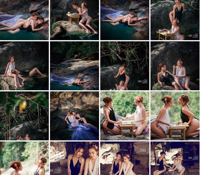 Nhân vật chính trong bộ ảnh “Thôn nữ” cũng là 2 cô gái trong trang phục khoe thân táo bạo với những tư thế tạo hình nóng bỏng mang tính gợi dục. Bối cảnh chụp bộ ảnh “Thôn nữ” cũng là ở ngoài trời, giữa thiên nhiên có núi non và sông nước.