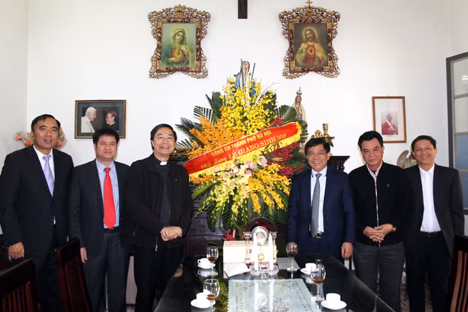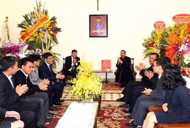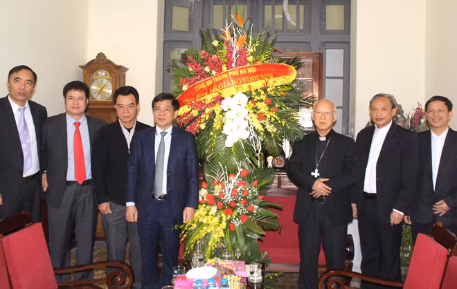 Thiếu tướng Đoàn Duy Khương (thứ tư, từ trái sang phải) chúc mừng ngài Tổng Giám mục Vũ Văn Thiên vừa được Tòa thánh Vatican bổ nhiệm làm Tổng Giám mục - Tổng giáo phận Hà Nội