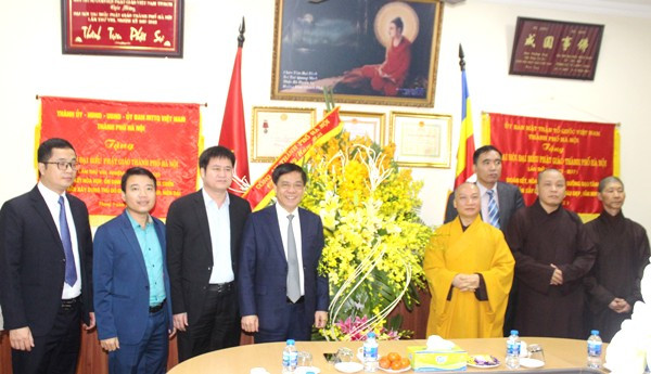 Thiếu tướng Đoàn Duy Khương tặng lẵng hoa, chúc Tết Ban trị sự Giáo hội Phật giáo Việt Nam TP Hà Nội