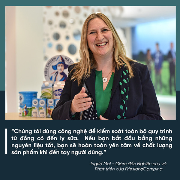 Bà Ingrid Mol: Luôn lấy nhu cầu người dùng làm trung tâm, Cô Gái Hà Lan có những chuyên gia về dinh dưỡng, đóng gói, phân phối... để mang đến sản phẩm tốt nhất. Ngoài Trung tâm nghiên cứu và phát triển ở Wageningen (Hà Lan) là nơi tiến hành các nghiên cứu nền tảng, chúng tôi còn có một trung tâm ở Singapore, chuyên nghiên cứu sản phẩm cho trẻ sơ sinh, trẻ nhỏ và người châu Á. Chúng tôi cũng có đội ngũ nghiên cứu và phát triển ở từng quốc gia, bao gồm Việt Nam. Họ sẽ địa phương hóa để sản phẩm phù hợp nhất với nhu cầu dinh dưỡng và khẩu vị người bản địa.