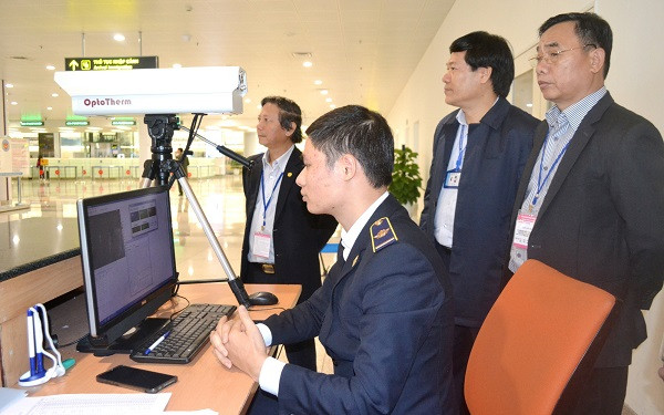Giám đốc Sở Y tế Hà Nội Nguyễn Khắc Hiền (đứng ngoài cùng bên phải) kiểm tra công tác giám sát dịch Covid-19 tại sân bay Nội Bài
