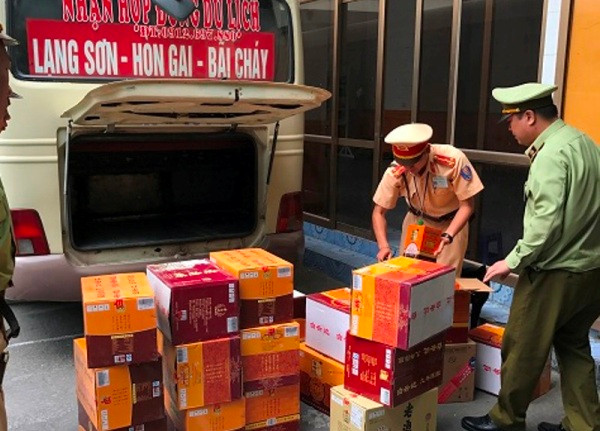 CSGT và các lực lượng chức năng thu giữ rượu lậu trên xe ô tô khách. Đây là mặt hàng thường được các đối tượng buôn lậu vận chuyển mạnh trong dịp cuối năm