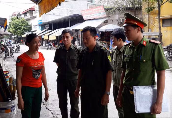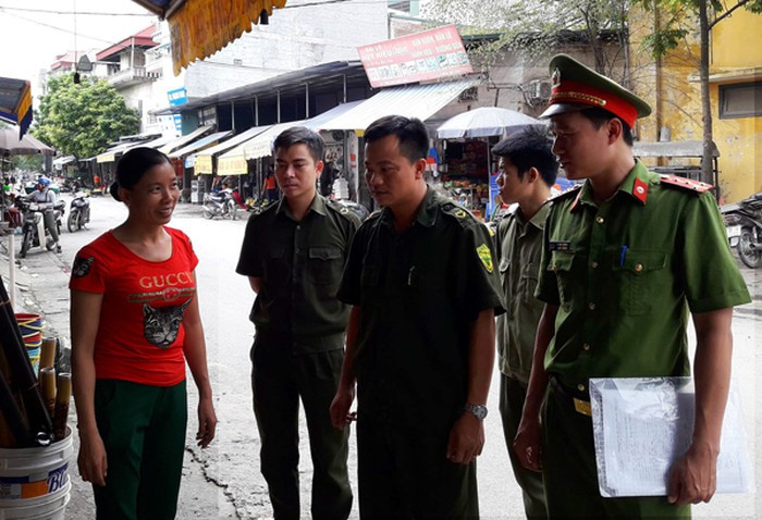 Lực lượng Công an xã Tân Triều và Công an huyện Thanh Trì phụ trách địa bàn xã Tân Triều tuyên truyền, nhắc nhở người dân không vi phạm trật tự đô thị