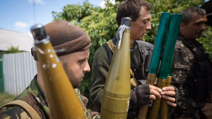 Các tay súng ly khai thân Nga chuẩn bị súng phóng lựu để giao chiến ở Seversk thuộc vùng Donetsk