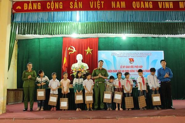 Đại diện các đơn vị tham gia ký giao ước an ninh nông thôn tại Vân Tảo trao quà cho các em nhỏ