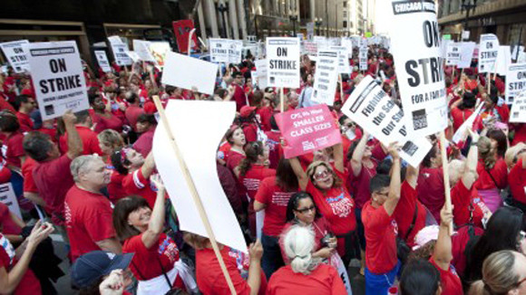 Công đoàn ngành giáo dục Chicago đã phát động đình công sau khi các cuộc thương thảo kéo dài hàng tháng mà không giải quyết những bất đồng chính trong kế hoạch cải cách hệ thống giáo dục công lập. Trọng tâm của cuộc tranh cãi giữa chính quyền thành phố và công đoàn giáo dục là chế độ lương bổng và quyền lợi của giáo viên, đặc biệt trong bối cảnh hệ thống các trường công lập của thành phố đang bị thiếu hụt ngân sách.