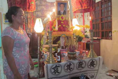 Chúng tôi tìm đến nhà bà Nguyễn Thị Mai lúc giữa trưa nắng, bà đang lặng ngồi uống nước với những người đến hỏi thăm ở chiếc bàn ngay sát bên bàn thờ con trai vừa mới được lập lên… Ngồi nói chuyện với chúng tôi mà đôi mắt bà luôn nhìn về phía bàn thờ con.