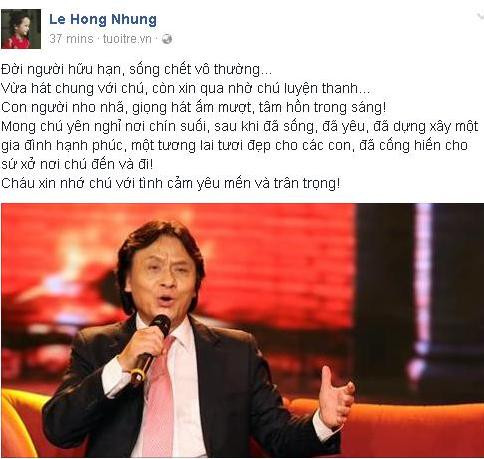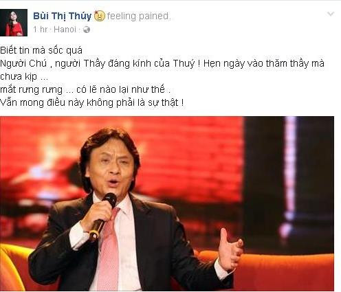 Ca sĩ trẻ Bùi Thị Thúy cũng bày tỏ sự bất ngờ và tiếc thương trước việc làng nhạc Việt đã mất đi thêm một người nghệ sĩ lớn: “Biết tin mà sốc quá. Người chú, người thầy đáng kính của Thúy. Hẹn ngày vào thăm thầy mà chưa kịp…Có lẽ nào lại như thế. Vẫn mong điều này không phải là sự thật!”.