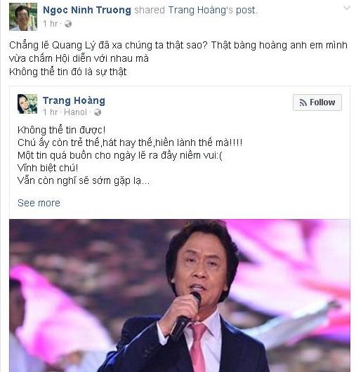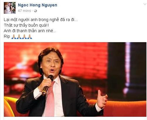 Từ Mỹ, ca sĩ Hồng Ngọc cũng hết sức bất ngờ khi hay tin NSƯT Quang Lý qua đời. Nữ ca sĩ chia sẻ: “Lại một người anh trong nghề đã ra đi. Thật sự thấy buồn quá!!!Anh đi thanh thản anh nhé. Rip”.