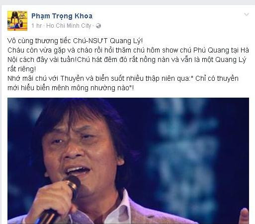 Đạo diễn Phạm Trọng Khoa cũng chia sẻ cảm xúc trước việc NSƯT Quang Lý đột ngột qua đời. Anh cho biết cách đây vài tuần còn gặp và chào hỏi NSƯT Quang Lý trong đêm nhạc của nhạc sĩ Phú Quang tại Hà Nội. “Chú hát đêm đó rất nồng nàn và vẫn là một Quang Lý rất riêng!Nhớ mãi chú với ‘Thuyền và biển’ suốt nhiều thập niên qua…”