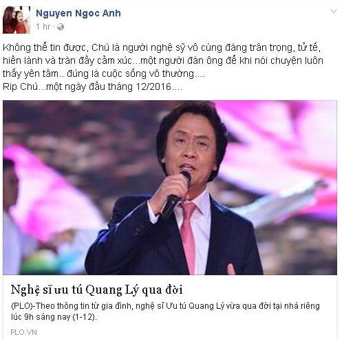 Cùng tâm trạng này, ca sĩ Nguyễn Ngọc Anh chia sẻ NSƯT Quang Lý là một người nghệ sĩ vô cùng đáng trân trọng, tử tế, hiền lành và tràn đầy cảm xúc. Cũng theo nữ ca sĩ gốc Quảng Ninh thì đó thực sự là một người đáng kính mà khi cô nói chuyện luôn thấy yên tâm. “Đúng là cuộc sống vô thường. Rip Chú…một ngày đầu tháng 12/2016” – Ngọc Anh bùi ngùi tâm sự.