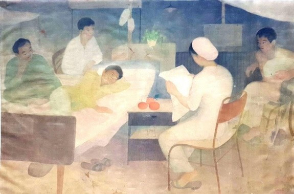 Bức tranh lụa "Đọc báo cho thương binh" của họa sĩ Trần Hữu Tê (1934 - 2002) hoàn thành năm 1975, khắc họa khung cảnh bên trong một lán cứu thương thời chiến. Những chiến sĩ như quên đi sự đau đớn của vết thương khi hướng sự chú ý lắng nghe về phía người nữ quân y đọc tin tức về các mặt trận.