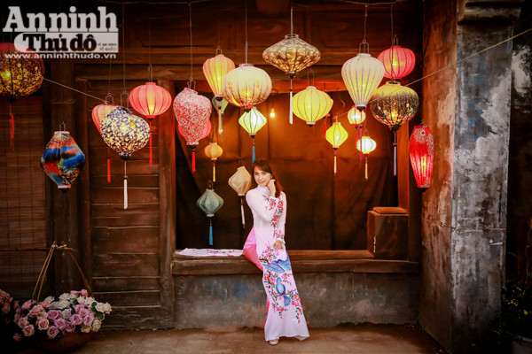 Thiếu nữ dịu dàng trong tà áo dài truyền thống với khung cảnh đèn lồng nhiều màu sắc.