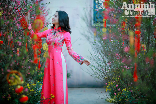 Trong trang phục áo dài, những thiếu nữ Hà Nội xinh xắn bên cây mai nở vàng… phía sau là mô hình những ngôi nhà cổ được làm hết sức công phu.