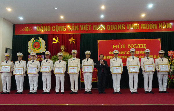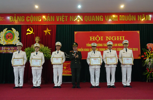 Đại tá Nguyễn Thế Hùng, Trưởng CAH Thanh Trì trao khen thưởng cho các tập thể, cá nhân có thành tích xuất sắc trong công tác đảm bảo ANTT năm 2018