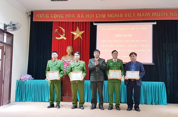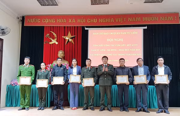 Thượng tá Nguyễn Song Toàn, Phó trưởng Phòng Phong trào toàn dân bảo vệ an ninh Tổ quốc tặng Giấy khen của Giám đốc CATP cho các cá nhân có thành tích trong đảm bảo ANTT cụm liên kết