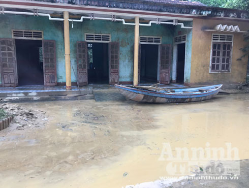 Quả đúng như những gì Thượng tá Phạm Thanh Hải nói, trụ sở UBND xã Hương Đông, dù được coi là có địa thế cao nhất nhưng những ngày qua nước cũng ngập kín tầng 1 và bây giờ thì hoang tàn như những ngôi nhà xung quanh. Bí thư Đảng ủy Nguyễn Hồng Sơn tiếp chúng tôi trong căn phòng nước đọng thành vũng dưới sàn và tanh mùi bùn.