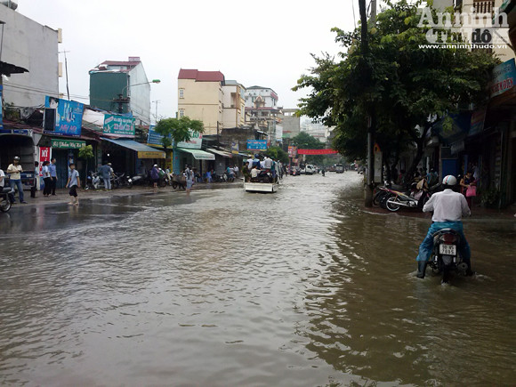 Những cơn mưa như trút nước đã khiến nước sông Nhuệ, đoạn chảy qua quận Hà Đông dâng cao, “nhấn chìm” hàng trăm mét đường Phùng Hưng, đoạn gần bệnh viện Quân y 103. Việc di chuyển tại đây vô cùng khó khăn. Chỉ có xe bus và xe ô tô vượt qua được đoạn đường ngập úng. Nhiều xe môtô đã chết máy, buộc phải dắt bộ khi cố gắng đi qua.