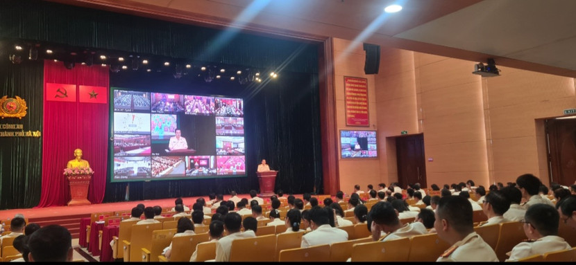 | Các đại biểu dự hội nghị tại điểm cầu chính hội trường Bộ Công an |