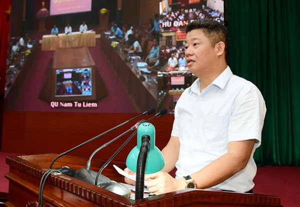 Giám đốc Sở Kế hoạch - Đầu tư Hà Nội Nguyễn Mạnh Quyền báo cáo tại hội nghị