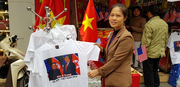 ANTD.VN - Nhân Hội nghị thượng đỉnh Mỹ- Triều Tiên sắp diễn ra, nhiều cửa hàng kinh doanh quần áo, đồ lưu niệm trên phố Hàng Bông (Hoàn Kiếm- Hà Nội) đã chớp thời cơ bán sản phẩm áo phông in hình Chủ tịch Triều Tiên Kim Jong Un và Tổng thống Mỹ Donald Trump cùng cờ của 2 nước.