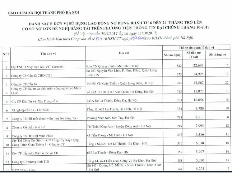 Hà Nội công bố danh sách 500 doanh nghiệp nợ đọng BHXH