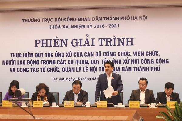 Đề nghị nhân dân, các cơ quan báo chí tiếp tục giám sát, cung cấp thông tin đề thành phố xử lý các vi phạm, Chủ tịch UBND TP cho biết, Hà Nội sẽ tiếp tục xây dựng các chế tài xử phạt trình HĐND TP xem xét để xử lý mạnh tay hơn với các hành vi vi phạm ứng xử nơi công cộng; xây dựng quy trình phân loại cán bộ công chức viên chức hàng tháng, hàng quý, hàng năm để siết chặt đội ngũ.