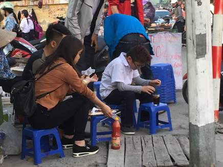Khách ăn thịt xiên ngay trên vỉa hè