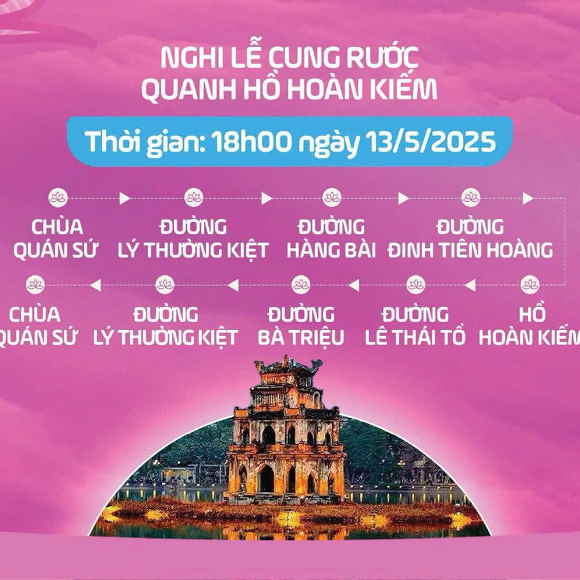 18h: Cung rước Xá Lợi từ Chùa Quán Sứ đi quanh Hồ Hoàn Kiếm dọc theo các cung đường: Lý Thường Kiệt – Phố Hàng Bài – Phố Đinh Tiên Hoàng – Hồ Hoàn Kiếm – Đường Lý Thái Tổ – Đường Bà Triệu – Phố Hai Trưng – Phố Quán Sứ.