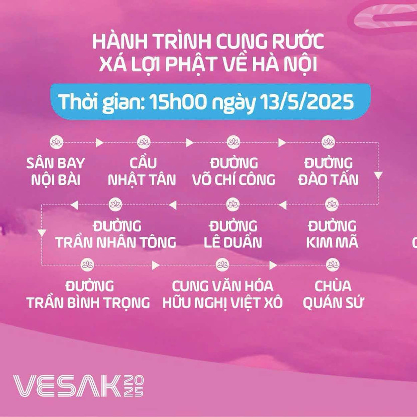 Theo thông tin từ Hội đồng trị sự, Giáo hội Phật giáo Việt Nam, 15h ngày 13/5/2025 (Tức 16/4 Â.L) Xá Lợi Phật sẽ được rước từ Sân bay Nội Bài qua các tuyến đường trọng yếu của Thủ đô: cầu Nhật Tân, Võ Chí Công, Đào Tấn, Kim Mã, Lê Duẩn, Trần Nhân Tông, Trần Bình Trọng, Cung Văn Hoá Hữu Nghị Việt Xô về chùa Quán Sứ.