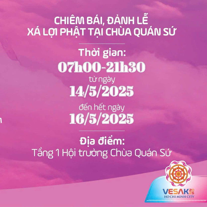 Từ ngày 14/5 đến sáng 16/5 ( 17 – Sáng 19/4 ÂL): 6h00 – 21h00: Xá Lợi được tôn trí tại tầng 1 hội trường Chùa Quán Sứ để Phật tử thập phương đến chiêm bái, đỉnh lễ.