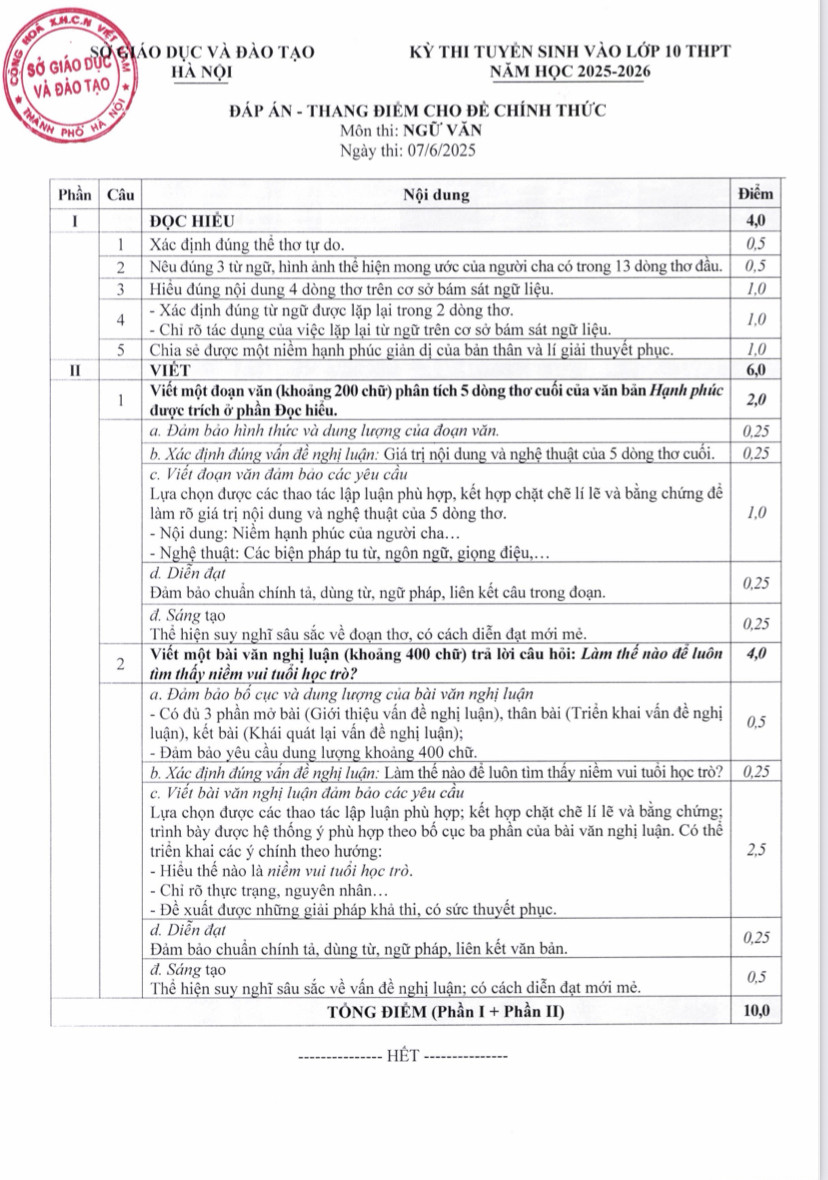 Sau khi kết thúc kỳ thi lớp 10 chuyên và không chuyên, chiều 11-6, Sở GD-ĐT Hà Nội đã công bố đáp án chính thức 3 môn thi không chuyên để phụ huynh, học sinh tham khảo.