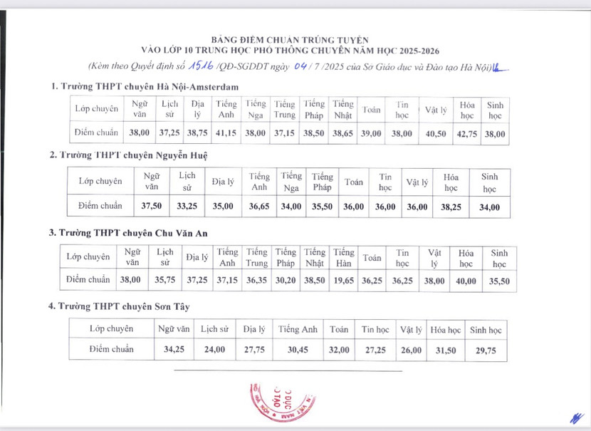 Tối 4-7, điểm chuẩn vào 78 lớp 10 của 4 trường THPT chuyên Hà Nội Amsterdam, Chu Văn An, Nguyễn Huệ và Sơn Tây đã được Sở GD-ĐT Hà Nội chính thức công bố.