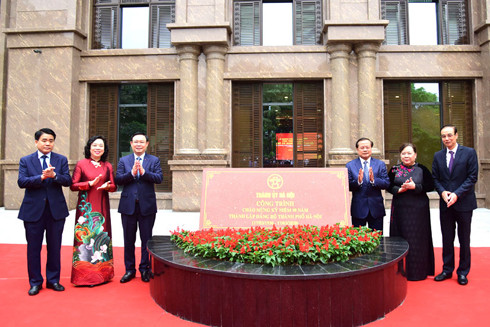 Các đồng chí lãnh đạo, nguyên lãnh đạo thành phố Hà Nội gắn biển công trình xây dựng trụ sở cơ quan Thành ủy Hà Nội, chào mừng kỷ niệm 90 năm Ngày thành lập Đảng bộ thành phố Hà Nội (17-3-1930 / 17-3-2020)