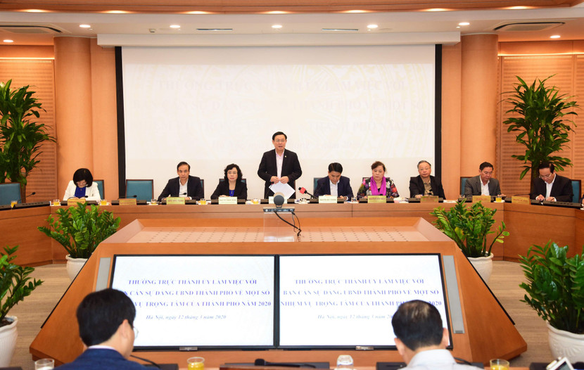 “Ngay khi dịch Covid-19 diễn ra, Thành ủy Hà Nội, Thường trực Thành ủy đã chỉ đạo Ban Cán sự Đảng UBND TP, Chủ tịch UBND TP xây dựng kịch bản ứng phó, đánh giá tác động của dịch bệnh tới phát triển kinh tế xã hội trên địa bàn Thủ đô và đề xuất giải pháp thực hiện với mục tiêu duy trì phát triển và hồi phục mạnh mẽ sau khi khống chế được dịch Covid-19” – Bí thư Thành ủy Vương Đình Huệ nói.