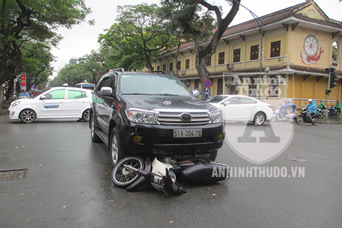 Khoảng 7 giờ 40 phút sáng 27-4, chiếc xe ô tô hiệu Toyota Fortuner mang BKS 51A-204.78 đã va chạm với xe máy Honda Dream mang BKS 29E1-624.55 tại ngã tư giao giữa phố Lý Thường Kiệt với Quán Sứ.