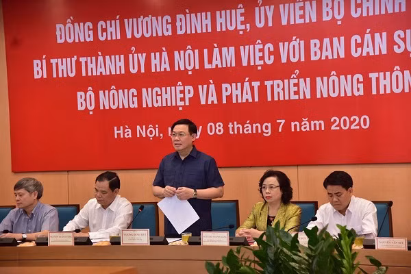 Chiều nay, 8-7, Ủy viên Bộ Chính trị, Bí thư Thành ủy Hà Nội Vương Đình Huệ làm việc với Ban Cán sự Đảng Bộ NN&PTNT. Ủy viên Trung ương Đảng, Bộ trưởng Bộ NN&PTNT Nguyễn Xuân Cường cùng chủ trì buổi làm việc.