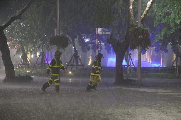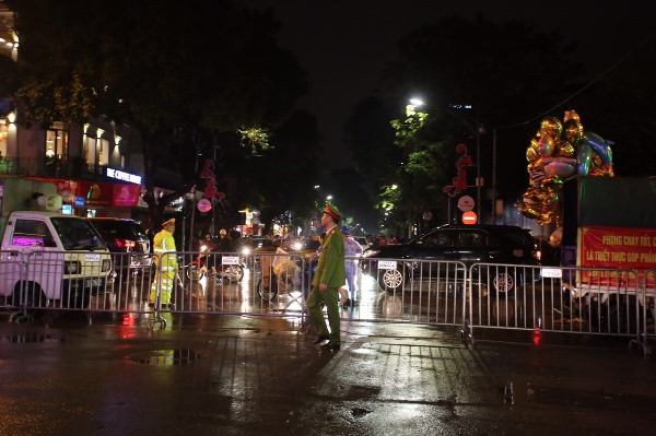 Lực lượng Công an Hà Nội luôn sẵn sàng triển khai phương án đảm bảo ANTT đêm giao thừa ở khu vực hồ Hoàn Kiếm dưới trời mưa to