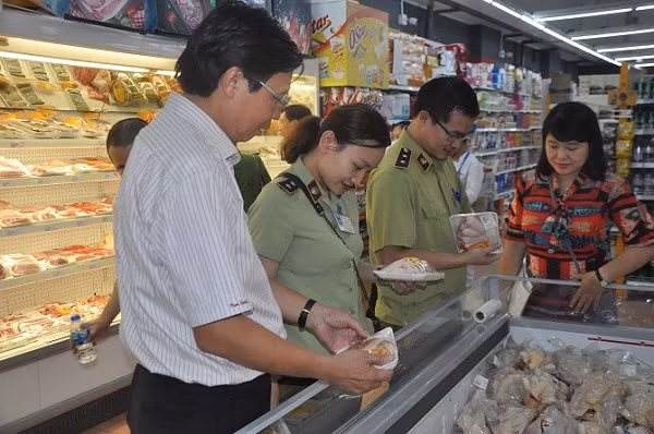 Phó Giám đốc Sở Y tế Hà Nội Trần Văn Chung (ngoài cùng) dẫn đầu đoàn kiểm tra liên ngành thành phố kiểm tra ATTP tại một siêu thị