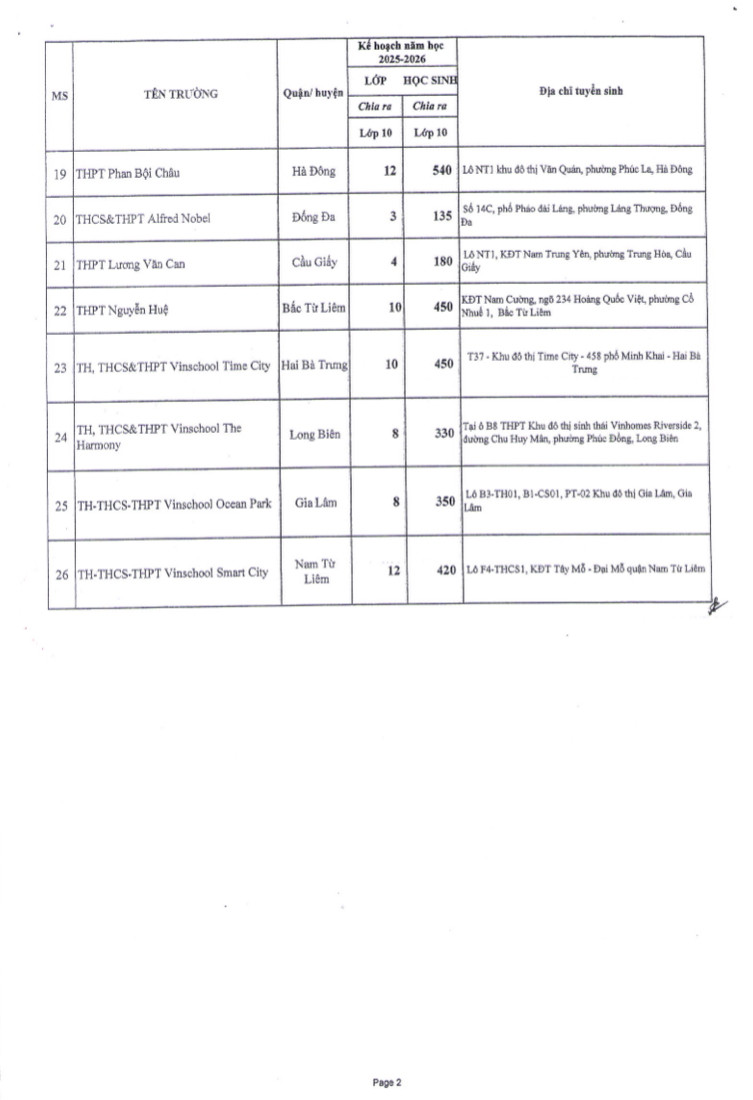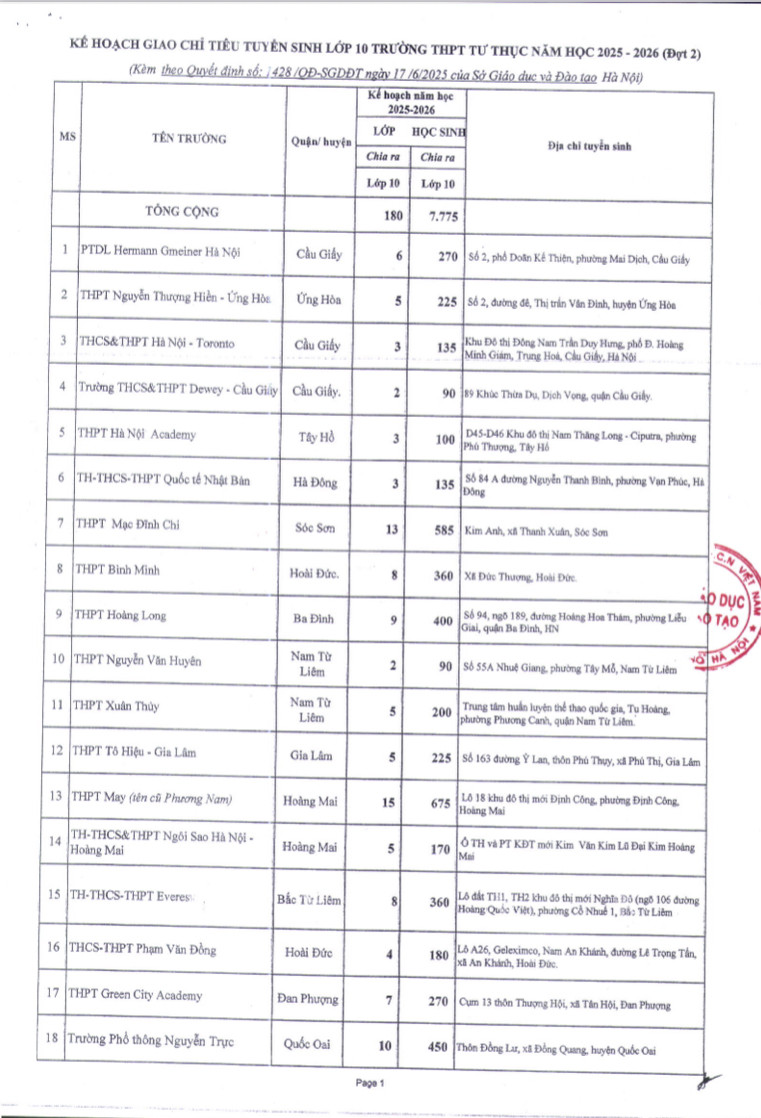 Ngày 18-6, Sở GD-ĐT Hà Nội chính thức giao chỉ tiêu kế hoạch tuyển sinh lớp 10 năm học 2025-2026 cho 26 trường THPT tư thục với 180 lớp 10 và 7.775 học sinh.