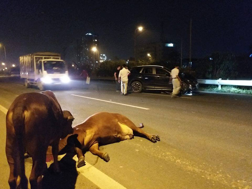 Điển hình vào tối qua 19-3, trên Đại lộ Thăng Long đoạn qua địa bàn huyện Hoài Đức 1 chiếc xe Honda CRV đã đâm vào đàn bò đi ngang qua đường, hậu quả chiếc xe con bị bẹp dúm đầu. Đáng nói, tuyến đường này đã có hộ lan, tôn, rào thép chắc chắn, vậy tại sao bò vẫn đi lạc được vào gây nguy hiểm cho người đi đường?.