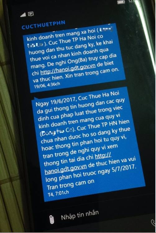 Cục Thuế Hà Nội đã 2 lần nhắn tin yêu cầu người kinh doanh qua mạng đăng ký thuế