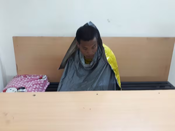 Tại trụ sở CAP, nam thanh niên này có vẻ "hiền" hơn, nhưng không nói năng gì và có biểu hiện tâm thần không ổn định.