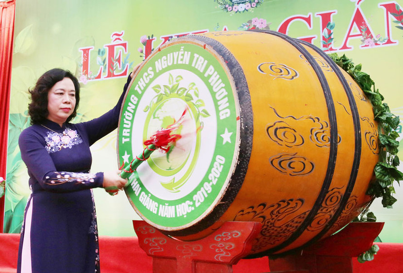 Phó Bí thư Thường trực Thành ủy Hà Nội Ngô Thị Thanh Hằng đánh trống khai giảng năm học mới tại trường THCS Nguyễn Tri Phương