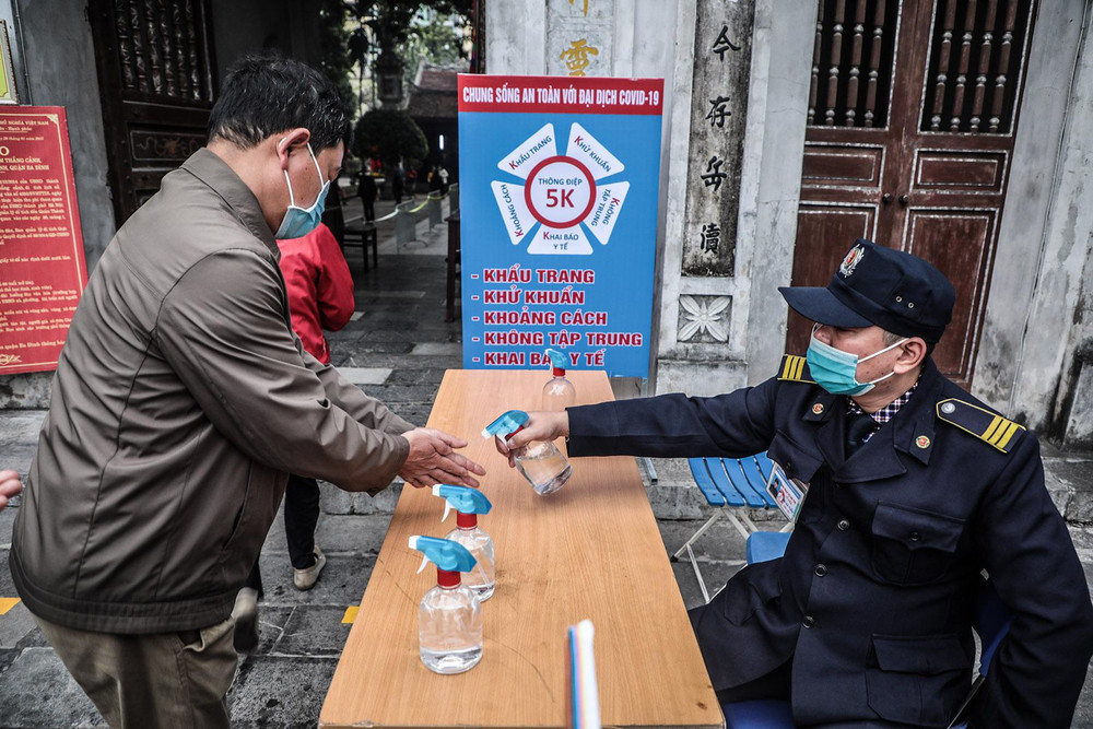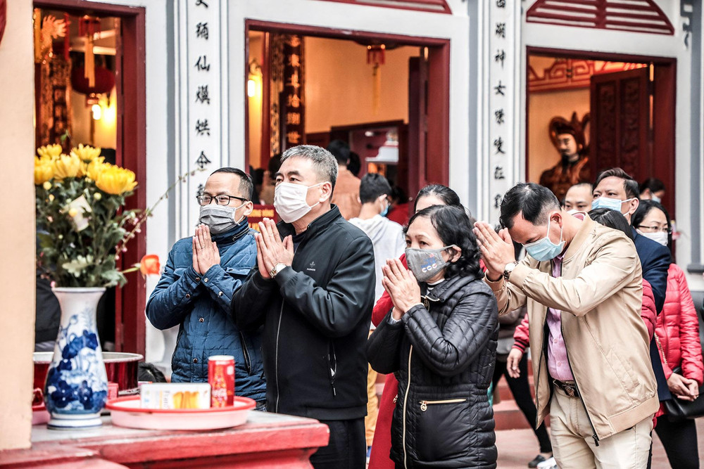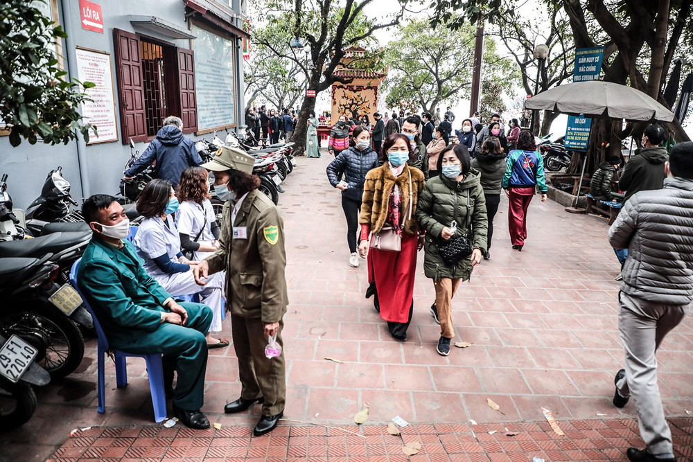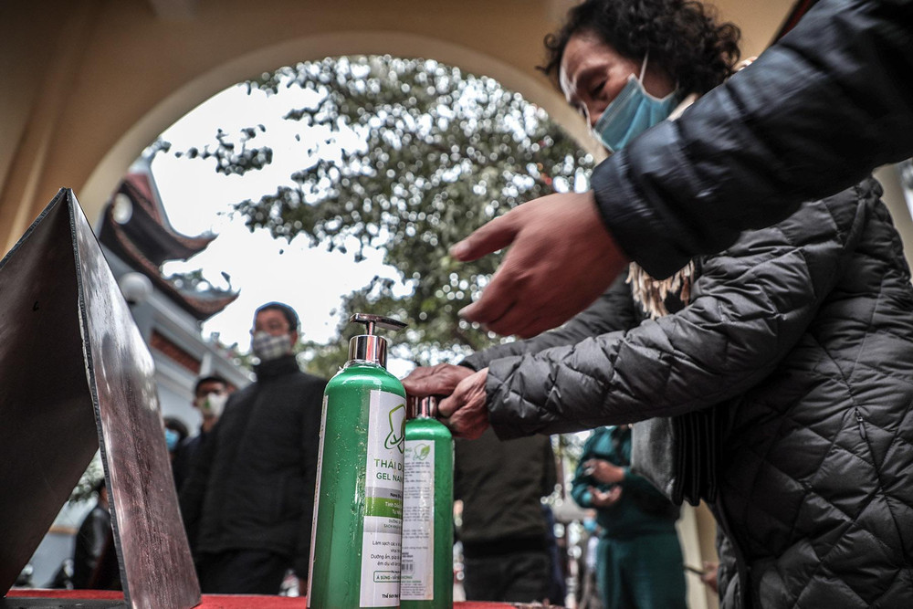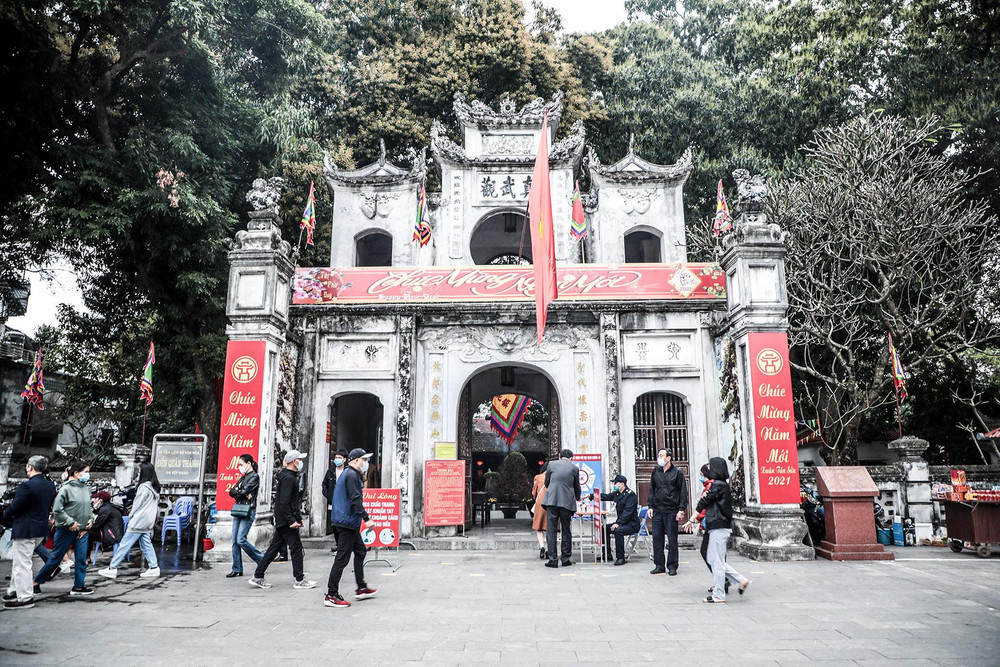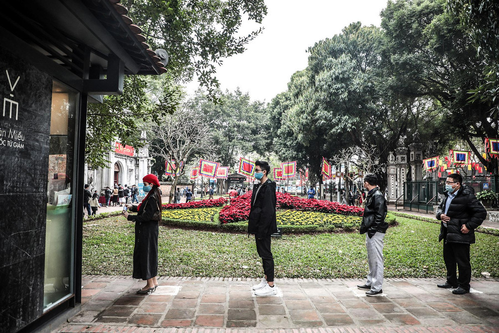 ANTD.VN - Sáng 12-2 (tức mùng 1 Tết Nguyên đán Tân Sửu), theo ghi nhận của phóng viên tại các điểm đền, chùa, phủ, danh lam ở Hà Nội vắng người hơn mọi năm. Các biện pháp phòng dịch như sát khuẩn, đeo khẩu trang được thực hiện nghiêm túc. Ông Đồ đeo khẩu trang viết chữ, người xếp hàng giữ khoảng cách để mua vé ở Văn Miếu - Quốc Tử Giám là hình ảnh ấn tượng về một Hà Nội đang quyết liệt thực hiện các biện pháp, không để dịch Covid-19 lây lan...